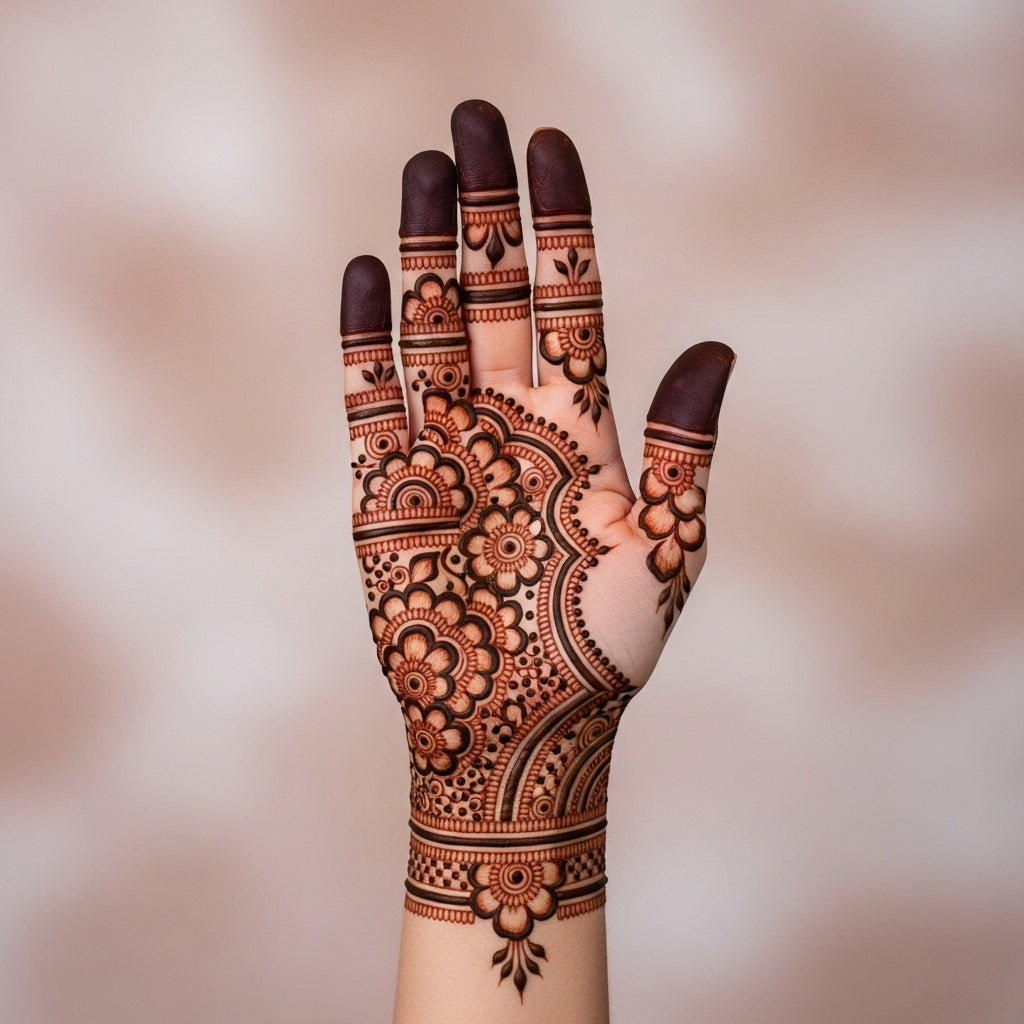 تصاميم حناء رائعة لليد الأمامية فقط! احصلي على نقوش حناء مذهلة، متقنة، وسريعة الجفاف لحفلات الزفاف، والأعياد، والمناسبات. احجزي مع أفضل فناني الحناء المحليين اليوم!